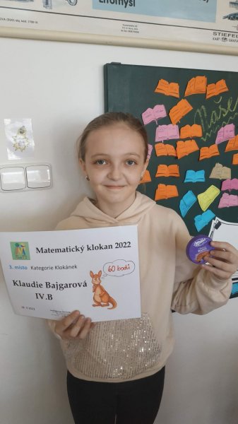 18. března jsme se zapojili do celostátně koordinované matematické soutěže „Matematický klokan“, ve kterém se nejvíce dařilo žákyni 4. B Klaudii Bajgarové, která se umístila na krásném 3. místě. Gratulujeme !
