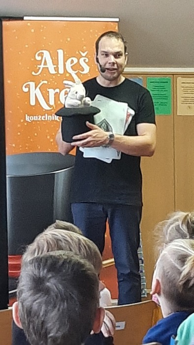 Odměnou za zvládnutí 1. pololetí bylo pro žáky vystoupení kouzelníka Aleše Krejčího. Program plný kouzel a zábavy se žákům moc líbil. Někteří se mohli kouzelnických triků zúčastnit. Čarovalo se s provázky, obrázky, mincemi, kartami a nechyběl ani králík Bobek z kouzelnického klobouku.