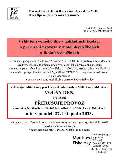 Úvod > Základní školy a ŠD > Aktuality > Volný den - ředitelské volno