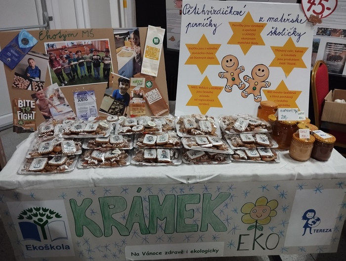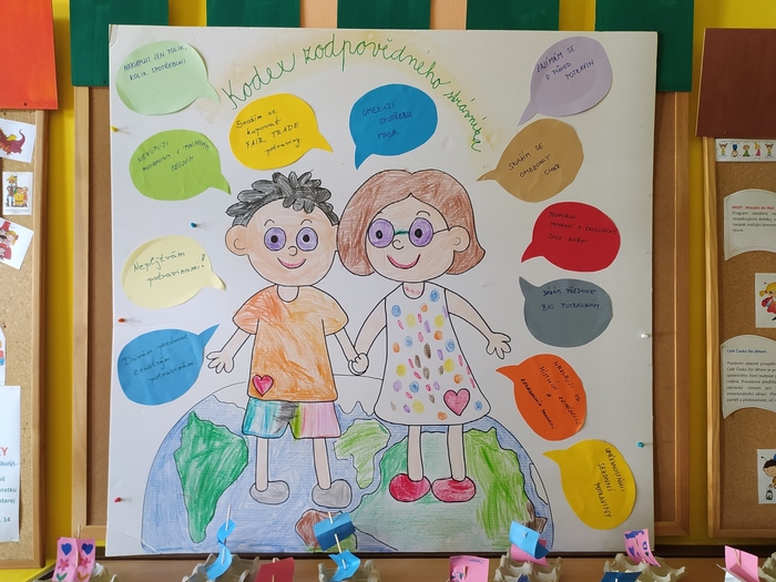 Ve školním roce 2023/2024 jsme si v ekotýmu zvolili téma Jídlo a svět. Během průzkumu školky jsme zjistili, že děti ani dospělí nemají zcela jasno v tom, co to znamená být zodpovědným strávníkem. Rozhodli jsme se, že se v tomto školním roce zaměříme na Kampaň zodpovědného strávníka. Jako základní pomůcka nám posloužila Metodická příručka Menu pro změnu s názvem 7 kroků k zodpovědné spotřebě potravin. Maskotem celého projektu se stal plyšový pan Křeček, který děti celý rok provázel a motivoval. Prvním počinem kampaně bylo vypracování informačních plakátů na téma Fair Trade. Tyto plakáty jsme poprvé použili na tradiční společné akci ekotýmů MŠ a ZŠ při společné oslavě Mezinárodního dne ekoškol. Ekotým MŠ seznámil ekotým ZŠ s tématem FAIR TRADE a připravil pro ně zábavnou tajenku na toto téma. Listopadový plán činností měl název Pětihvězdičkové perníčky z naší školičky a rodiče spolu s dětmi měli za úkol vyrobit perníčky podle pěti zásad: použít zdravé potraviny z českého ekologického zemědělství, regionální suroviny, fair tradové výrobky, vajíčka z volného chovu a poslední ingrediencí byla láska. Tyto perníčky jsme pak prodávali na vánočním jarmarku při obecní akci Rozsvěcování vánočního stromu, kde jsme také prezentovali informační plakáty o fair trade produktech. Další velkou aktivitou kampaně bylo zpracování informačního plakátu pro naši školní jídelnu týkající se sezonního ovoce a zeleniny, který jsme vyrobili společně s rodiči na schůzce velkého ekotýmu a děti ho předaly vedoucí školní jídelny. V rámci Dne země jsme si společně s celou mateřskou školou vysadili do vyvýšených záhonů vlastní zeleninu. Na začátku měsíce května se děti zúčastnily edukativního programu s názvem Odkud pochází jídlo firmy Vitaminátor Sosnová. V souladu s tématem ekoškoly se dozvěděly hravou formou o výhodách regionálních potravin a způsobech jejich zpracování. Druhý plán činností měl název: Férová buchta, kdy jsme se volně inspirovali akcí Světový den pro fair trade s názvem Férová snídaně NaZemi. Rodiče se svými dětmi upekli buchtu opět v souladu s pěti zásadami jako u perníčků a tyto buchty jsme podávali jako občerstvení na Jarní besídce naší školky společně s férovou kávičkou, kterou jsme nabízeli i na dalších menších akcích pro rodiče během celého školního roku. Na závěr kampaně jsme společně s ekotýmem vypracovali plakát s názvem Kodex zodpovědného strávníka, který jsme vystavili v šatně školky, abychom inspirovali všechny rodiče i děti. Celý ekotým se shodl na tom, že férové kávičky a buchtičky můžeme nabízet i v dalších letech při různých akcích mateřské školky.